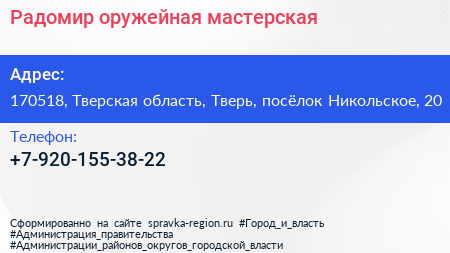 Радомир, оружейная мастерская по адресу 170518, Тверская область, Тверь, посёлок Никольское, 20 в дальнейшем Организация, размещена в следующих категориях: