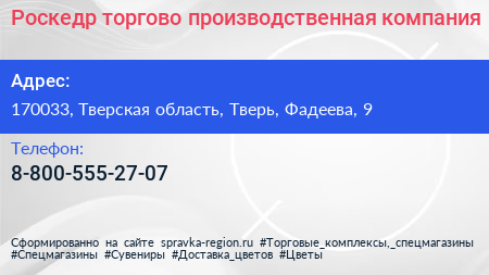 Роскедр, торгово-производственная компания по адресу 170033, Тверская область, Тверь, Фадеева, 9 в дальнейшем Организация, размещена в следующих категориях: