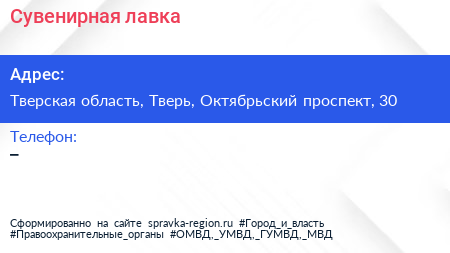 Сувенирная лавка по адресу Тверская область, Тверь, Октябрьский проспект, 30 в дальнейшем Организация, размещена в следующих категориях: