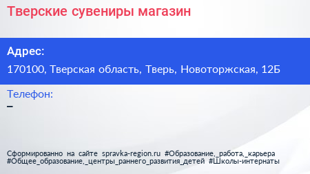 Тверские сувениры, магазин по адресу 170100, Тверская область, Тверь, Новоторжская, 12Б в дальнейшем Организация, размещена в следующих категориях: