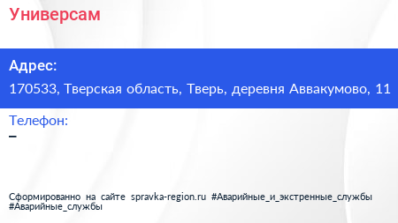 Универсам по адресу 170533, Тверская область, Тверь, деревня Аввакумово, 11 в дальнейшем Организация, размещена в следующих категориях: