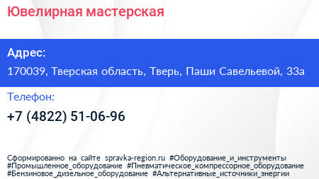 Ювелирная мастерская по адресу 170039, Тверская область, Тверь, Паши Савельевой, 33а в дальнейшем Организация, размещена в следующих категориях: