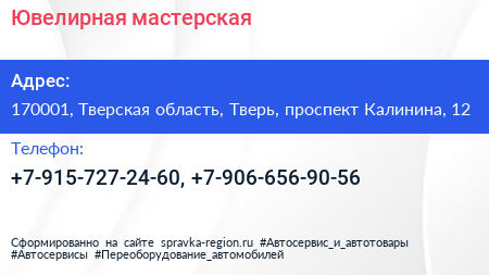 Ювелирная мастерская по адресу 170001, Тверская область, Тверь, проспект Калинина, 12 в дальнейшем Организация, размещена в следующих категориях: