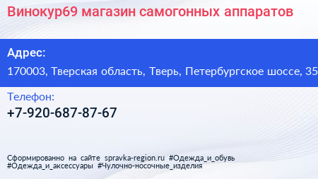 Винокур69, магазин самогонных аппаратов по адресу 170003, Тверская область, Тверь, Петербургское шоссе, 35 в дальнейшем Организация, размещена в следующих категориях: