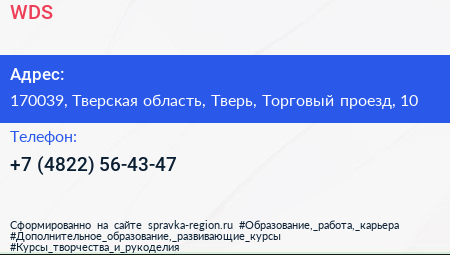 WDS по адресу 170039, Тверская область, Тверь, Торговый проезд, 10 в дальнейшем Организация, размещена в следующих категориях: