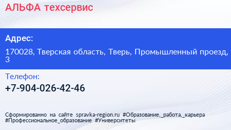 АЛЬФА, техсервис по адресу 170028, Тверская область, Тверь, Промышленный проезд, 3 в дальнейшем Организация, размещена в следующих категориях:
