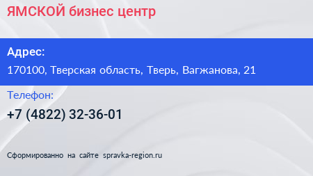 ЯМСКОЙ, бизнес-центр по адресу 170100, Тверская область, Тверь, Вагжанова, 21 в дальнейшем Организация, размещена в следующих категориях: