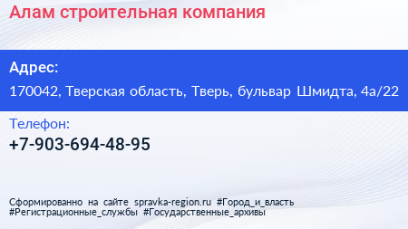 Алам, строительная компания по адресу 170042, Тверская область, Тверь, бульвар Шмидта, 4а/22 в дальнейшем Организация, размещена в следующих категориях: