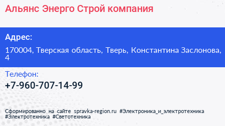 Альянс Энерго Строй, компания по адресу 170004, Тверская область, Тверь, Константина Заслонова, 4 в дальнейшем Организация, размещена в следующих категориях: