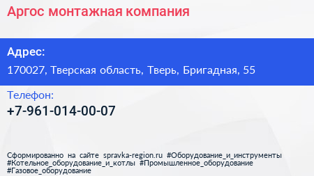 Аргос, монтажная компания по адресу 170027, Тверская область, Тверь, Бригадная, 55 в дальнейшем Организация, размещена в следующих категориях: