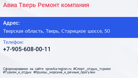 Авиа-Тверь-Ремонт, компания по адресу Тверская область, Тверь, Старицкое шоссе, 50 в дальнейшем Организация, размещена в следующих категориях: