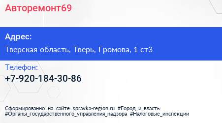 Авторемонт69 по адресу Тверская область, Тверь, Громова, 1 ст3 в дальнейшем Организация, размещена в следующих категориях: