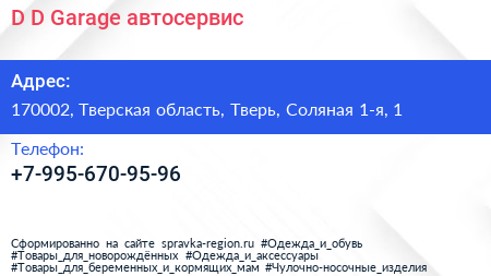 D & D Garage, автосервис по адресу 170002, Тверская область, Тверь, Соляная 1-я, 1 в дальнейшем Организация, размещена в следующих категориях: