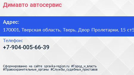 Димавто, автосервис по адресу 170001, Тверская область, Тверь, Двор Пролетарки, 15 ст5 в дальнейшем Организация, размещена в следующих категориях: