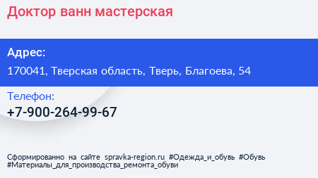 Доктор ванн, мастерская по адресу 170041, Тверская область, Тверь, Благоева, 54 в дальнейшем Организация, размещена в следующих категориях: