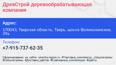 ДревСтрой, деревообрабатывающая компания по адресу 170043, Тверская область, Тверь, шоссе Волоколамское, 39а в дальнейшем Организация, размещена в следующих категориях: