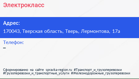 Электрокласс по адресу 170043, Тверская область, Тверь, Лермонтова, 17а в дальнейшем Организация, размещена в следующих категориях:
