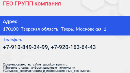 ГЕО-ГРУПП, компания по адресу 170100, Тверская область, Тверь, Московская, 1 в дальнейшем Организация, размещена в следующих категориях: