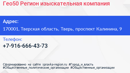 Гео50 Регион, изыскательная компания по адресу 170001, Тверская область, Тверь, проспект Калинина, 9 в дальнейшем Организация, размещена в следующих категориях: