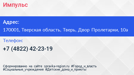 Импульс по адресу 170001, Тверская область, Тверь, Двор Пролетарки, 10а в дальнейшем Организация, размещена в следующих категориях: