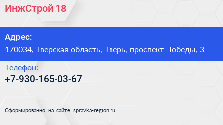 ИнжСтрой-18 по адресу 170034, Тверская область, Тверь, проспект Победы, 3 в дальнейшем Организация, размещена в следующих категориях: