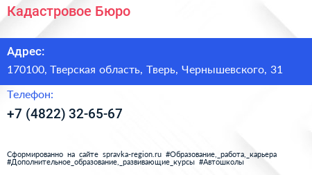 Кадастровое Бюро по адресу 170100, Тверская область, Тверь, Чернышевского, 31 в дальнейшем Организация, размещена в следующих категориях: