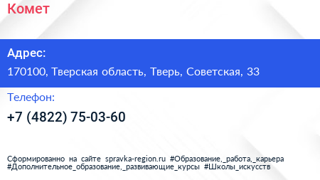 Комет по адресу 170100, Тверская область, Тверь, Советская, 33 в дальнейшем Организация, размещена в следующих категориях: