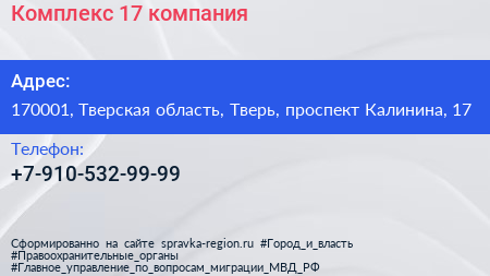 Комплекс 17, компания по адресу 170001, Тверская область, Тверь, проспект Калинина, 17 в дальнейшем Организация, размещена в следующих категориях: