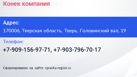 Конек, компания по адресу 170006, Тверская область, Тверь, Головинский вал, 19 в дальнейшем Организация, размещена в следующих категориях: