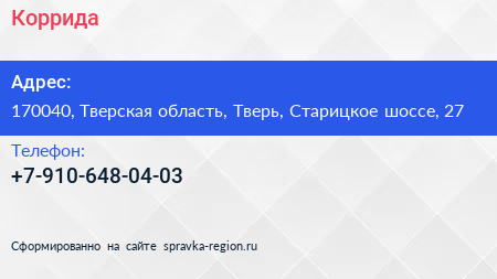 Коррида по адресу 170040, Тверская область, Тверь, Старицкое шоссе, 27 в дальнейшем Организация, размещена в следующих категориях: