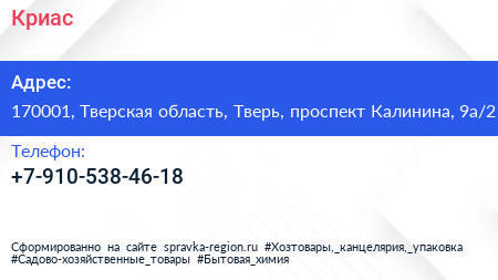 Криас по адресу 170001, Тверская область, Тверь, проспект Калинина, 9а/2 в дальнейшем Организация, размещена в следующих категориях: