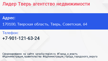 Лидер-Тверь, агентство недвижимости по адресу 170100, Тверская область, Тверь, Советская, 64 в дальнейшем Организация, размещена в следующих категориях: