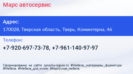 Марс, автосервис по адресу 170028, Тверская область, Тверь, Коминтерна, 46 в дальнейшем Организация, размещена в следующих категориях: