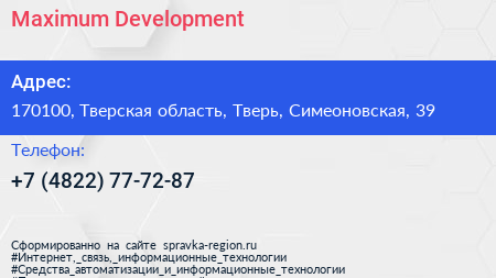 Maximum Development по адресу 170100, Тверская область, Тверь, Симеоновская, 39 в дальнейшем Организация, размещена в следующих категориях: