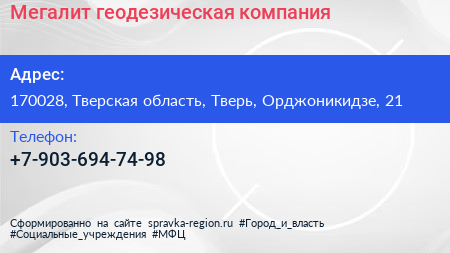 Мегалит, геодезическая компания по адресу 170028, Тверская область, Тверь, Орджоникидзе, 21 в дальнейшем Организация, размещена в следующих категориях: