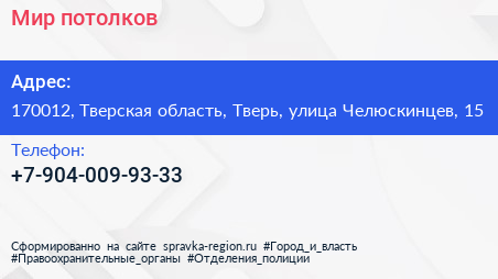 Мир потолков по адресу 170012, Тверская область, Тверь, улица Челюскинцев, 15 в дальнейшем Организация, размещена в следующих категориях: