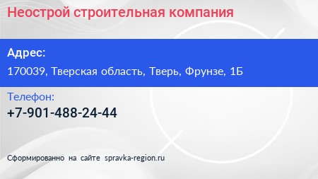 Неострой, строительная компания по адресу 170039, Тверская область, Тверь, Фрунзе, 1Б в дальнейшем Организация, размещена в следующих категориях: