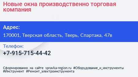 Новые окна, производственно-торговая компания по адресу 170001, Тверская область, Тверь, Спартака, 47в в дальнейшем Организация, размещена в следующих категориях: