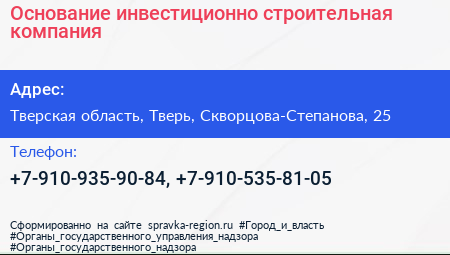 Основание, инвестиционно-строительная компания по адресу Тверская область, Тверь, Скворцова-Степанова, 25 в дальнейшем Организация, размещена в следующих категориях:
