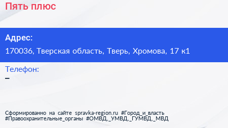 Пять плюс по адресу 170036, Тверская область, Тверь, Хромова, 17 к1 в дальнейшем Организация, размещена в следующих категориях: