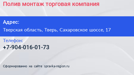 Полив-монтаж, торговая компания по адресу Тверская область, Тверь, Сахаровское шоссе, 17 в дальнейшем Организация, размещена в следующих категориях: