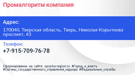 Промалгоритм, компания по адресу 170040, Тверская область, Тверь, Николая Корыткова проспект, 43 в дальнейшем Организация, размещена в следующих категориях: