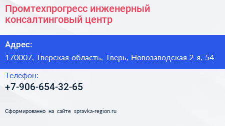 Промтехпрогресс, инженерный консалтинговый центр по адресу 170007, Тверская область, Тверь, Новозаводская 2-я, 54 в дальнейшем Организация, размещена в следующих категориях: