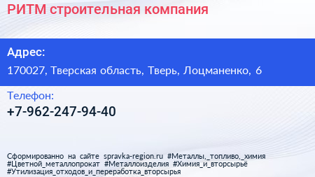 РИТМ, строительная компания по адресу 170027, Тверская область, Тверь, Лоцманенко, 6 в дальнейшем Организация, размещена в следующих категориях: