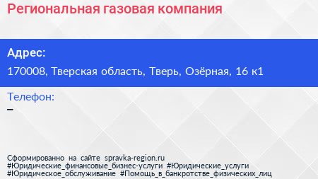 Региональная газовая компания по адресу 170008, Тверская область, Тверь, Озёрная, 16 к1 в дальнейшем Организация, размещена в следующих категориях: