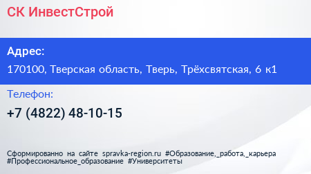 СК ИнвестСтрой по адресу 170100, Тверская область, Тверь, Трёхсвятская, 6 к1 в дальнейшем Организация, размещена в следующих категориях: