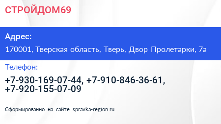 СТРОЙДОМ69 по адресу 170001, Тверская область, Тверь, Двор Пролетарки, 7а в дальнейшем Организация, размещена в следующих категориях: