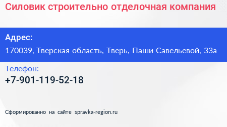 Силовик, строительно-отделочная компания по адресу 170039, Тверская область, Тверь, Паши Савельевой, 33а в дальнейшем Организация, размещена в следующих категориях: