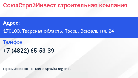 СоюзСтройИнвест, строительная компания по адресу 170100, Тверская область, Тверь, Вокзальная, 24 в дальнейшем Организация, размещена в следующих категориях: