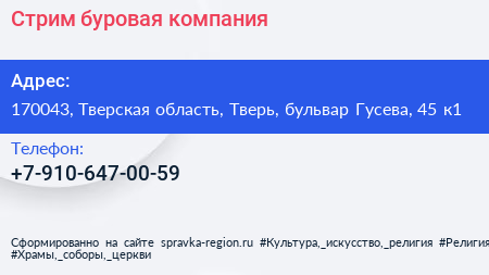 Стрим, буровая компания по адресу 170043, Тверская область, Тверь, бульвар Гусева, 45 к1 в дальнейшем Организация, размещена в следующих категориях: